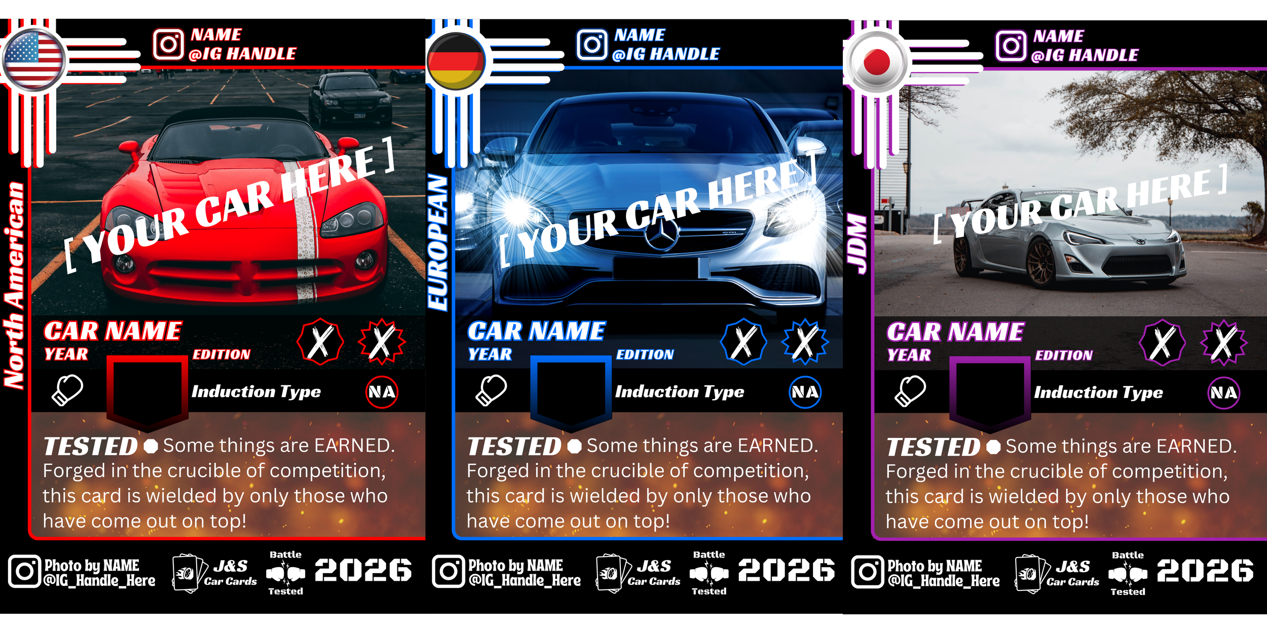 Battle Tested is a Bracket Styled tournament that you can enter every quarter. Cards are assigned a random opponent and fight for the popular vote on our Instagram page. The ultimate winner is awarded a Battle Tested Edition along with 9 FREE cards to start them off right!